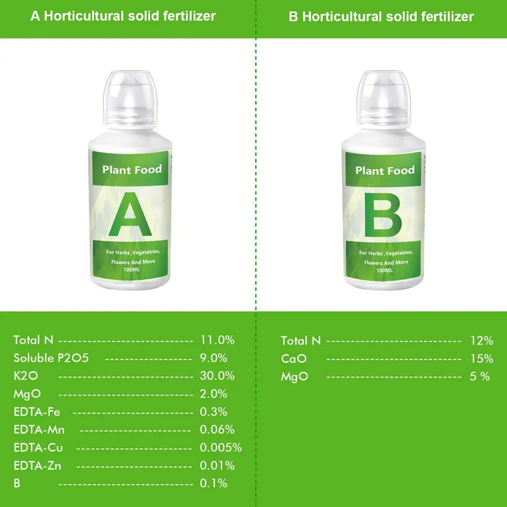 Note: It is forbidden to mix fertilizer A and fertilizer B directly in the solid or mother solution state. When using, the amount of fertilizer A and fertilizer B must be equal.
